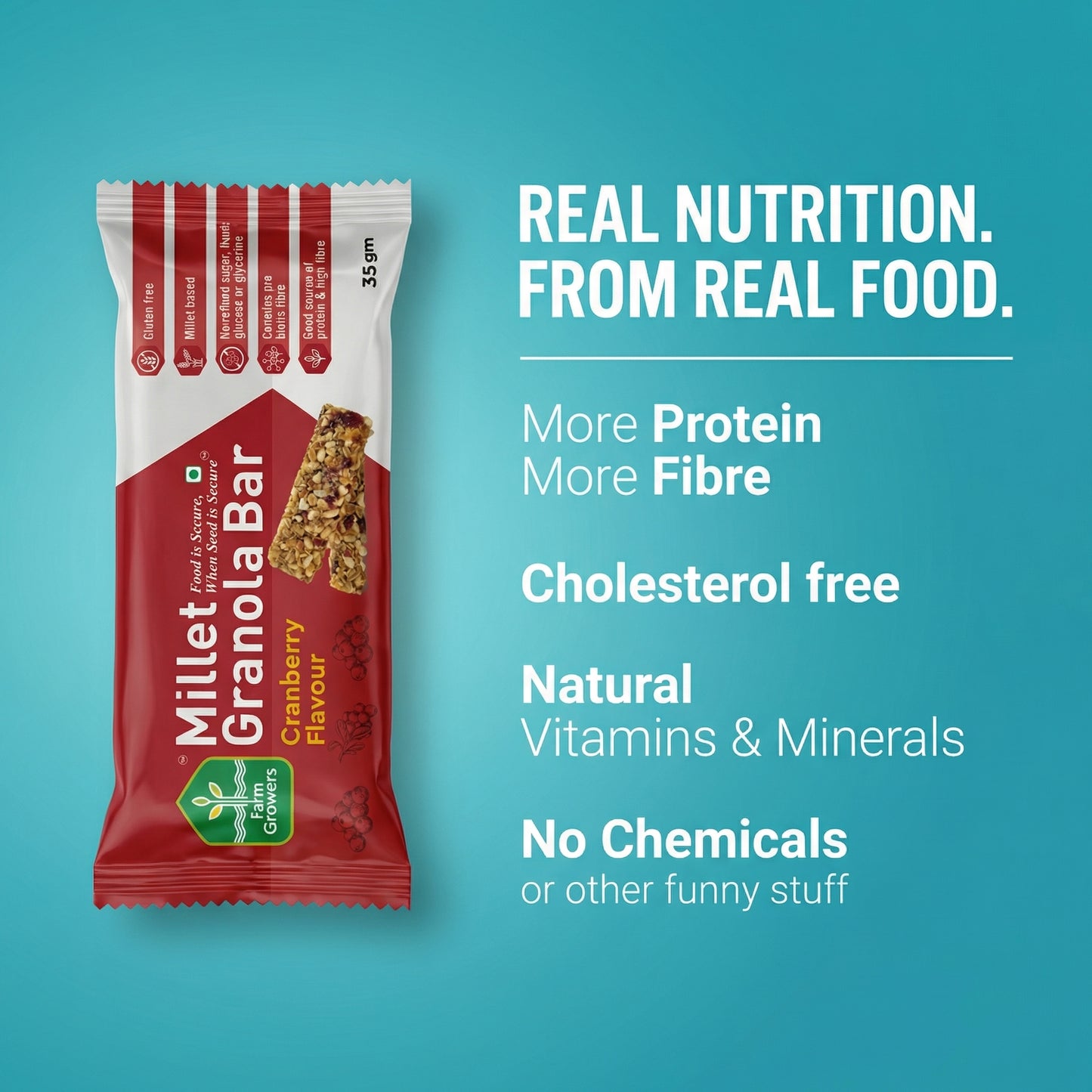Indulge in the perfect blend of cranberries and orange in our premium millet granola bar. Packed with wholesome ingredients, gluten-free, and bursting with natural flavors for a guilt-free snacking experience.