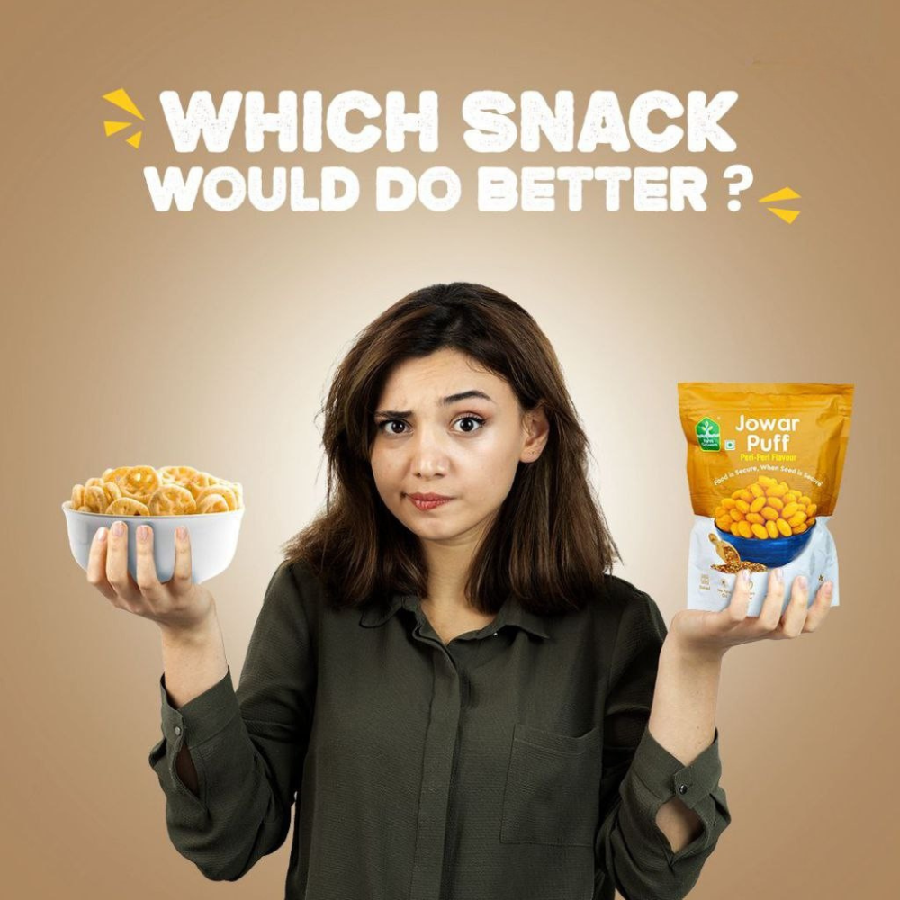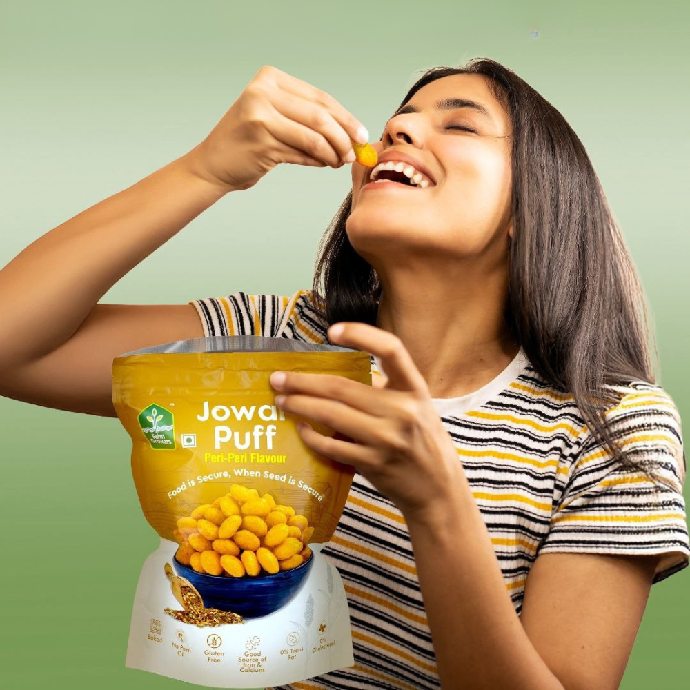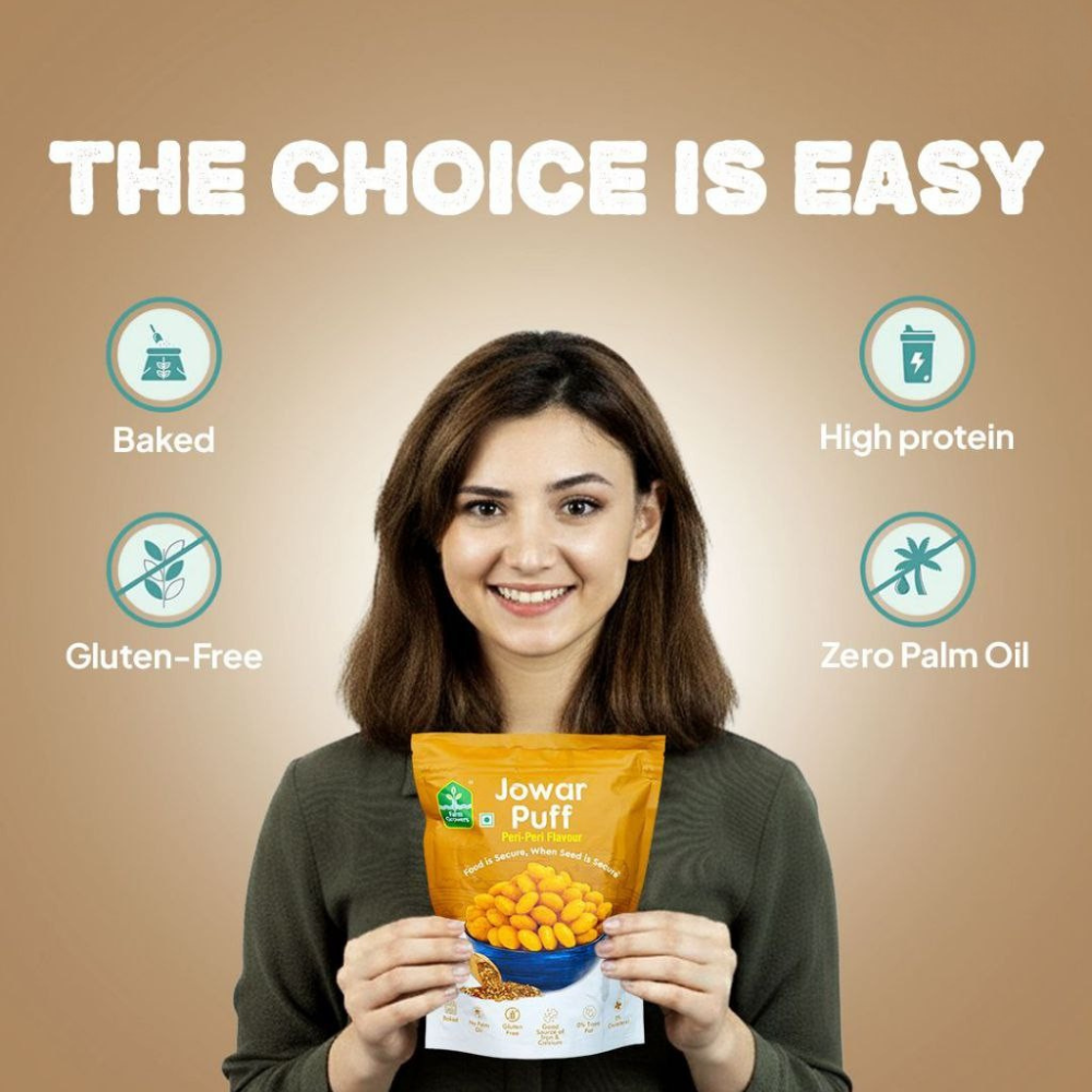 A crunchy, guilt-free snack made from nutritious jowar (sorghum) and blended with a zesty peri peri seasoning. Perfect for munching anytime, these puffs come in a handy 40g pack.