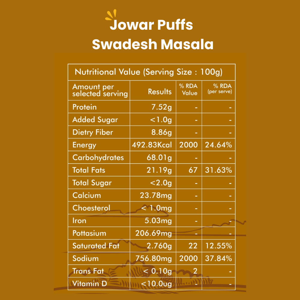 Each 100g serving delivers essential nutrients your body needs. Rich in protein, dietary fiber, and complex carbohydrates, our Jowar Puffs provide sustained energy without the guilt. Low in saturated fat and cholesterol-free, they're the smart choice for health-conscious snackers.