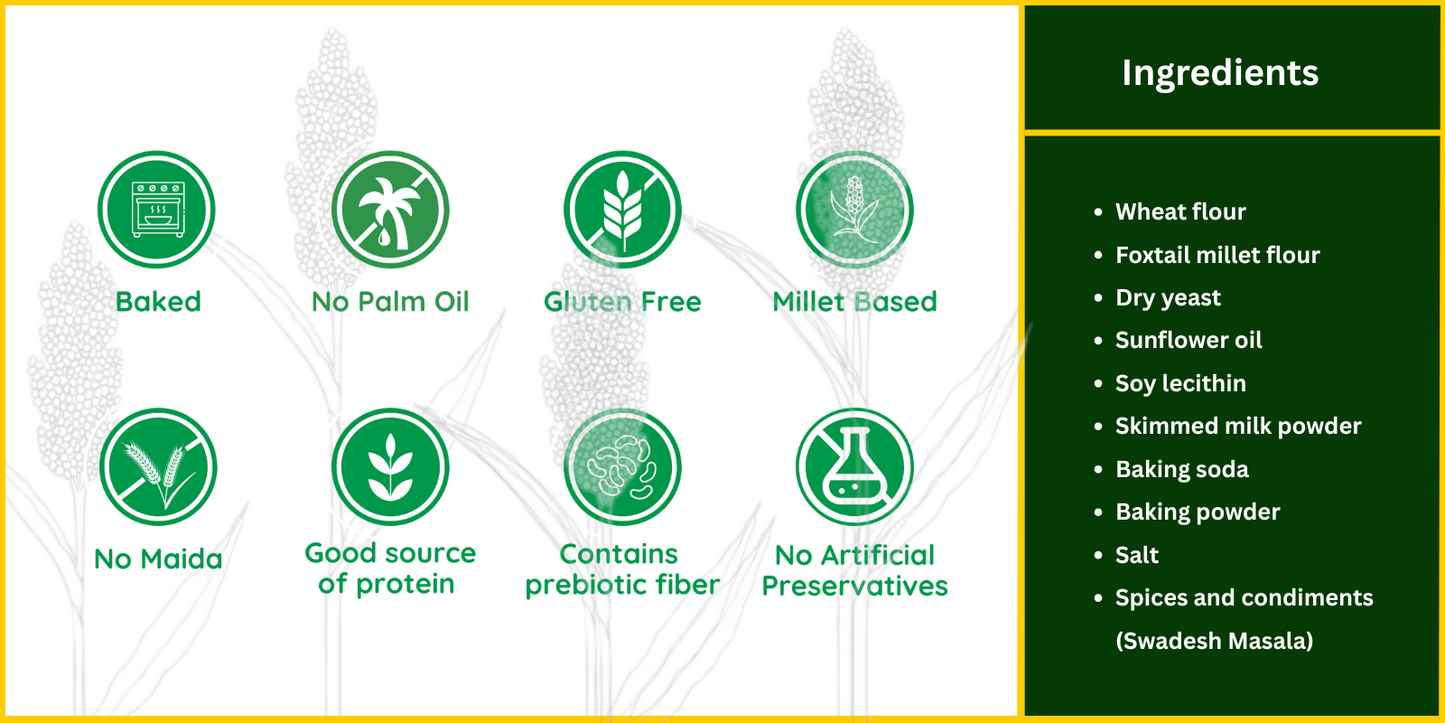 Experience the authentic taste of Swadesh Masala in these crunchy millet crackers. Made with nutritious millets, they combine flavor and health in every bite. Perfect for guilt-free snacking anytime, at home or on the go.